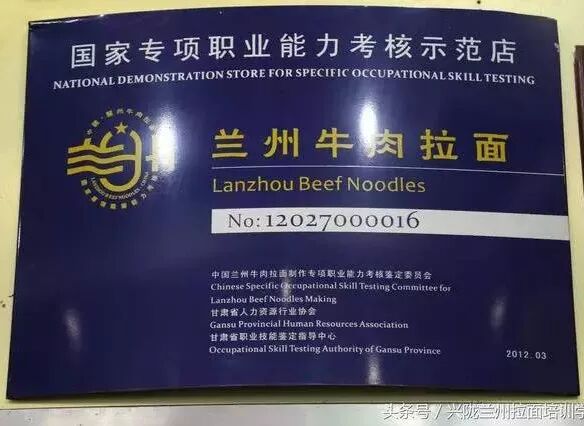 五、2012年兰州牛肉拉面被国家人社部职业技能鉴定中心列为我们国家专项职业能力鉴定项目之一。同年底由甘肃省人社厅发起成立的兰州牛肉拉面职业培训学校《甘肃兴陇兰州牛肉拉面职业培训学校》正式成立。