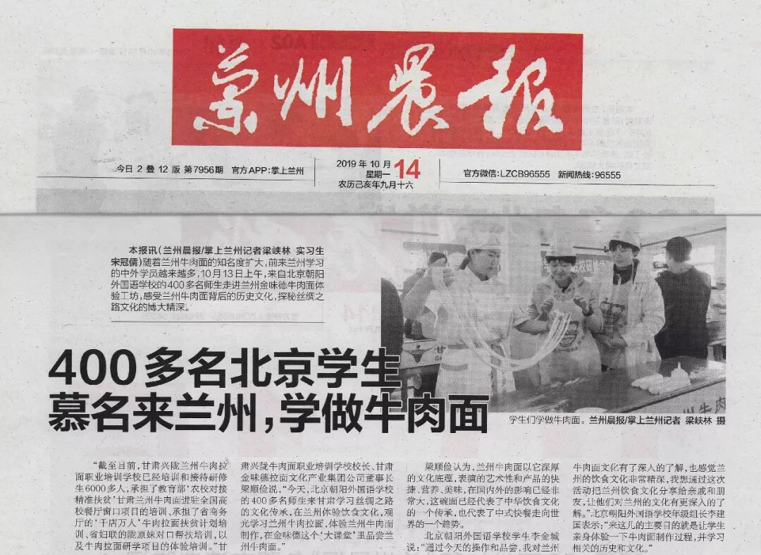 兰州牛肉拉面享誉世界,10月12-13日两天,来自北京朝阳外国语学校的400多名师生走进兰州金味德,感受兰州牛肉面背后的历史文化,探秘丝绸之路博大精深。获得多家媒体争相报道。
