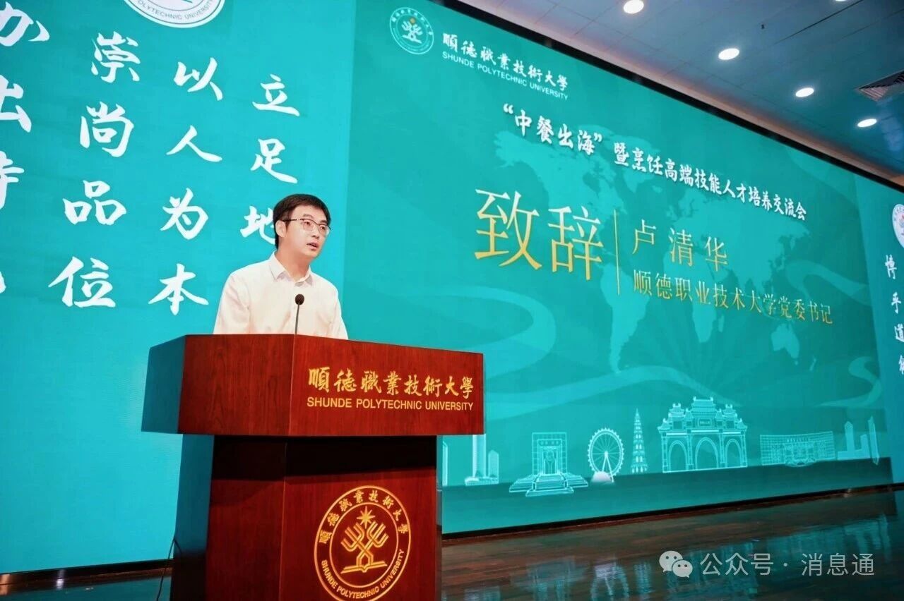 顺德职业技术大学党委书记卢清华致辞介绍,顺德职业技术大学烹饪学院是全国唯一挂牌的 “中国烹饪学院”,也是国务院侨办五个 “中餐出海工程 - 中餐繁荣基地” 之一,学校依托全国数智餐饮行业产教融合共同体、粤菜预制菜产业学院等平台,联动行业龙头企业共建厨电产品应用研究中心,已形成特色鲜明、教产融合的烹饪人才育人体系,为中餐行业持续输送优质人才。