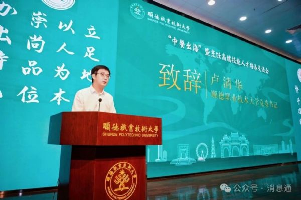 顺德职业技术大学党委书记卢清华致辞介绍,顺德职业技术大学烹饪学院是全国唯一挂牌的 “中国烹饪学院”,也是国务院侨办五个 “中餐出海工程 - 中餐繁荣基地” 之一,学校依托全国数智餐饮行业产教融合共同体、粤菜预制菜产业学院等平台,联动行业龙头企业共建厨电产品应用研究中心,已形成特色鲜明、教产融合的烹饪人才育人体系,为中餐行业持续输送优质人才。