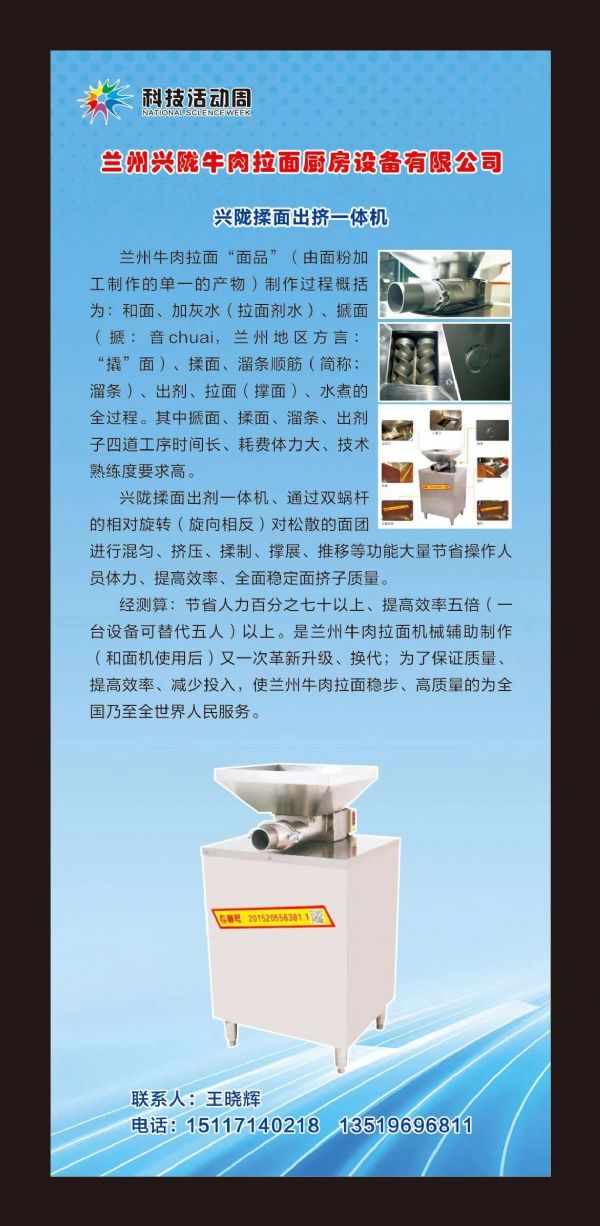 主要用于代替兰州牛肉拉面、饴络面、河南烩面、扯面、山西刀削面、福山拉面、西安油泼面等面团的人工揉制环节,